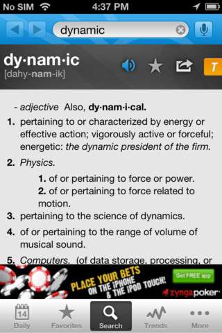 Dictionary.com is one of the best available Dictionary apps for the iPhone, and costs nothing. The app is available for iPhone,iPod Touch and iPad with IOS 3.1 and later.The free Dictionary.com app delivers trusted reference content from Dictionary.com and Thesaurus.com. No internet connection is required to search words. The app includes nearly 2,000,000 words, definitions, synonyms and antonyms. It also features audio pronunciation, voice-to-text search and Dictionary.com’s popular Word of the Day and The Hot Word blog.