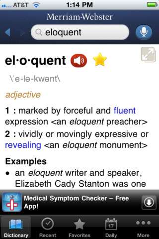 Merriam-Webster Dictionary is an iPhone versionof the online, helpful dictionary website by the same name. The app provides a colossal data bank of words and meanings, and also provides the user with the option to mark certain definitions as “favorite” and provides phonetics and audio playback of the word.